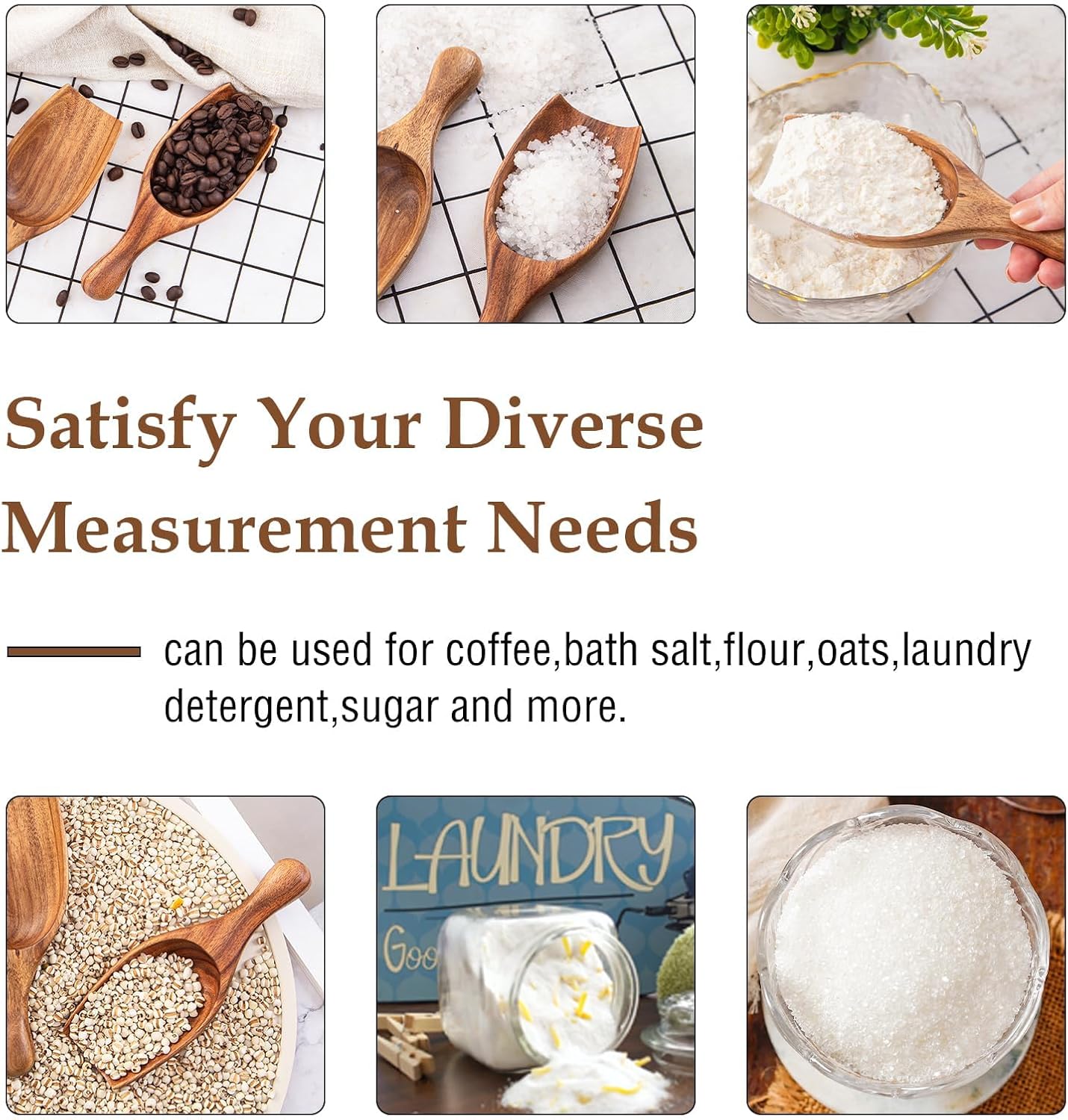 - Meet all needs: Our scoop handles ALL your measuring needs—coffee, tea, sugar, flour, spices, laundry detergent, even supplements (protein powder, creatine) and stevia! No more juggling multiple tools; Our wood scoop covers every daily scooping task