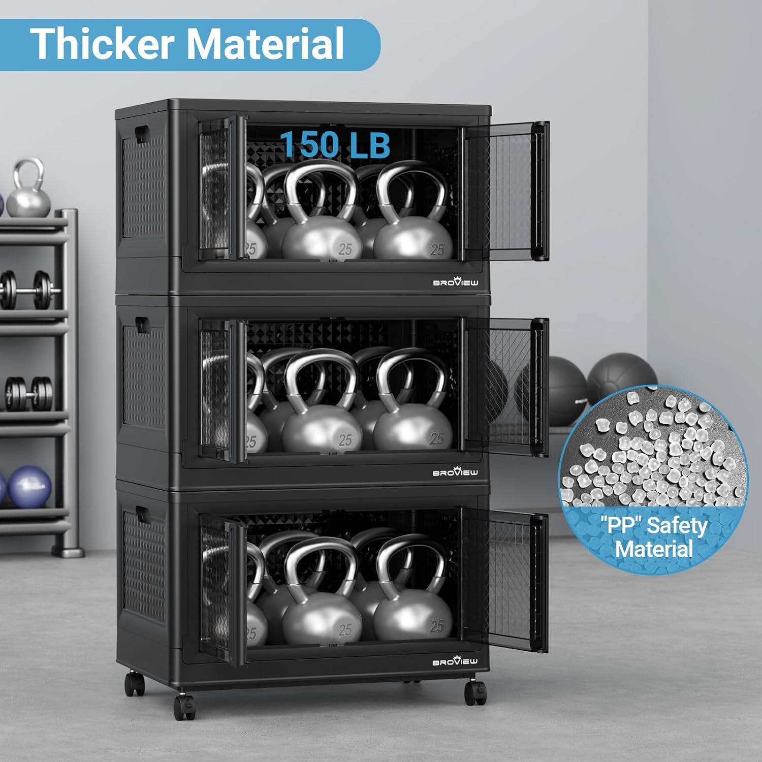 BROVIEW 600 Qt Stackable Storage Bins with Lids & Doors, 6 Pack Plastic Closet Organizer and Storage Drawers with Wheels, Large Collapsible Storage Boxes, Cabinet for Home, Office, V10, Black