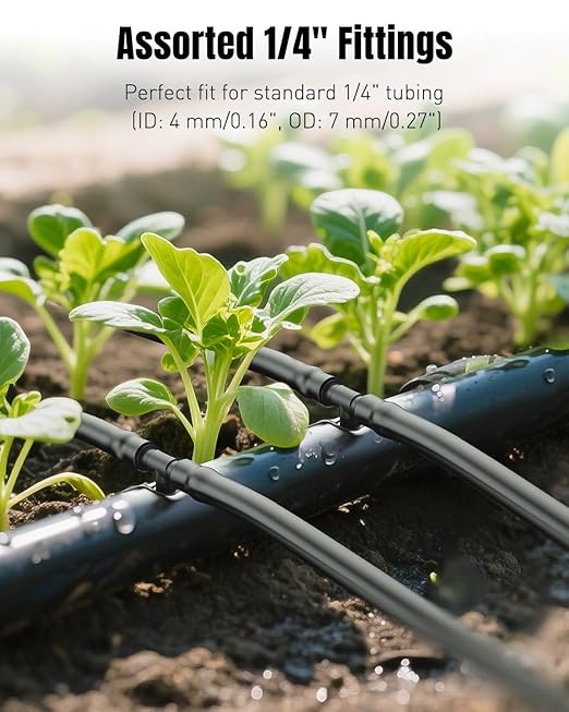 - 150-Piece 1/4" Fittings Set: Include couplings, tees, 4-way connectors, elbows, and end caps β all compatible with standard 1/4" tubing (ID: 4 mm/0.16", OD: 7 mm/0.27"). For easier installation, soak both 1/2" and 1/4" tubing in hot water to soften them