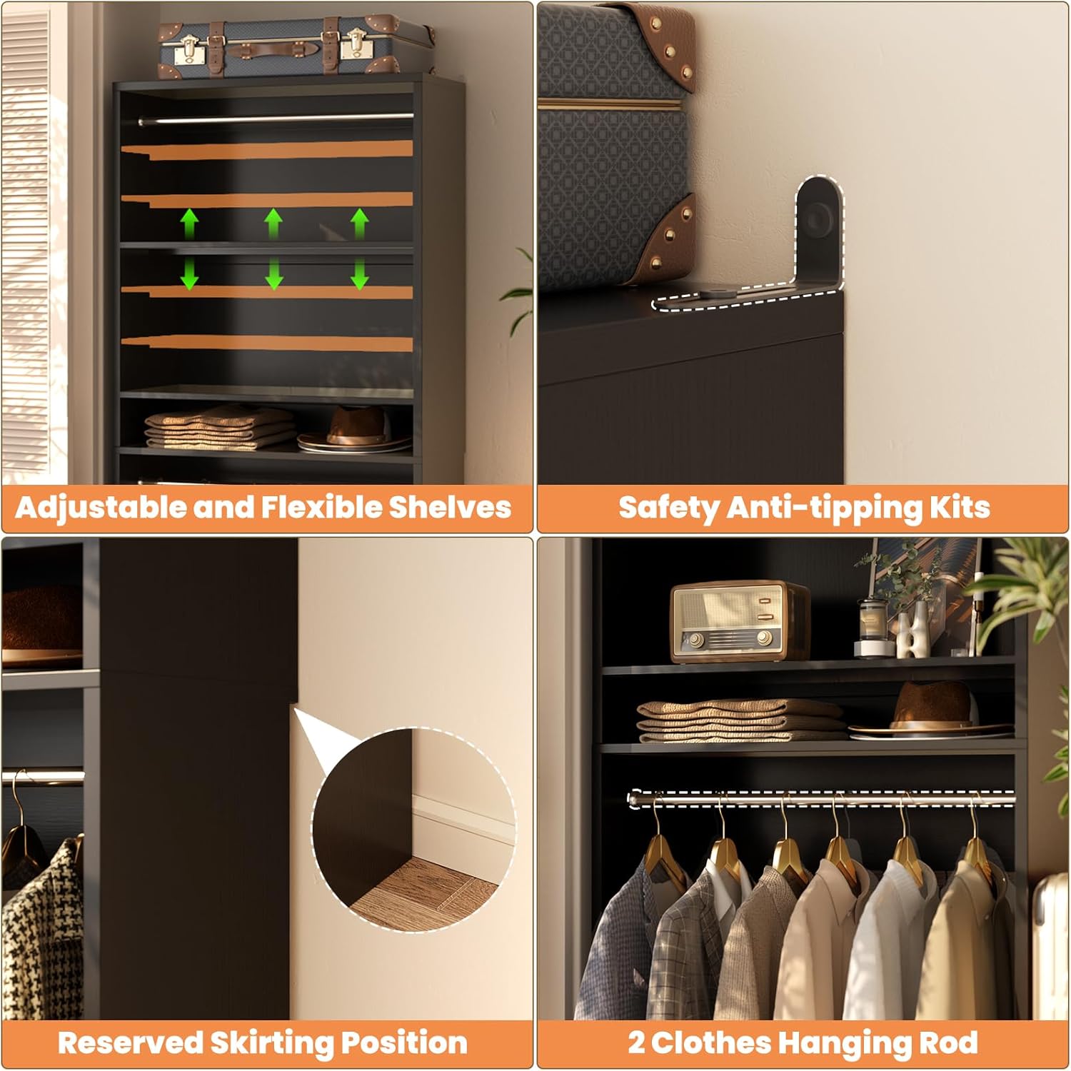 - 【Easy Assembly & Anti-Tip Safety】Due to the height of the closet system, we recommend having 2 people for installation. Includes step-by-step instructions and pre-labeled hardware for quick setup. Anti-tip restraint kits secure the unit to walls for safety.