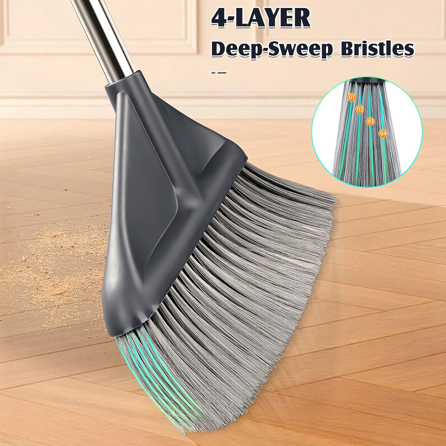 Broom and Dustpan Set for Home with 52 Inch Long Angled Handle - Stand Up Dustpan No Warping Metal Edge, Ergonomic Sweeping, 4 Layer Bristles and Hair Cleaning Teeth for Kitchen Office