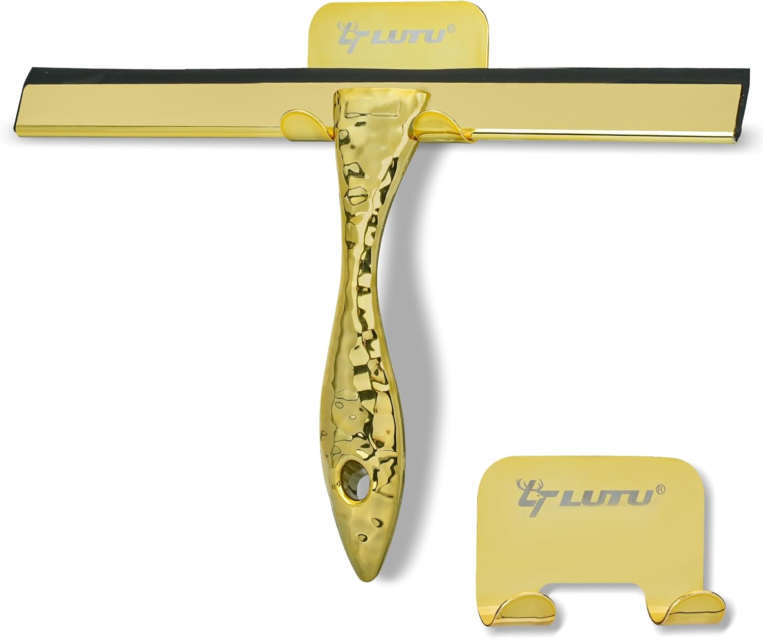 All-Purpose Silicone Shower Squeegee for Shower Glass Door,with 1 Hooks,for Bathroom Glass, Car, Tile Wall, Mirror Cleaning - Flower Shaped Handle for Easy-Grip 14 Inch Golden