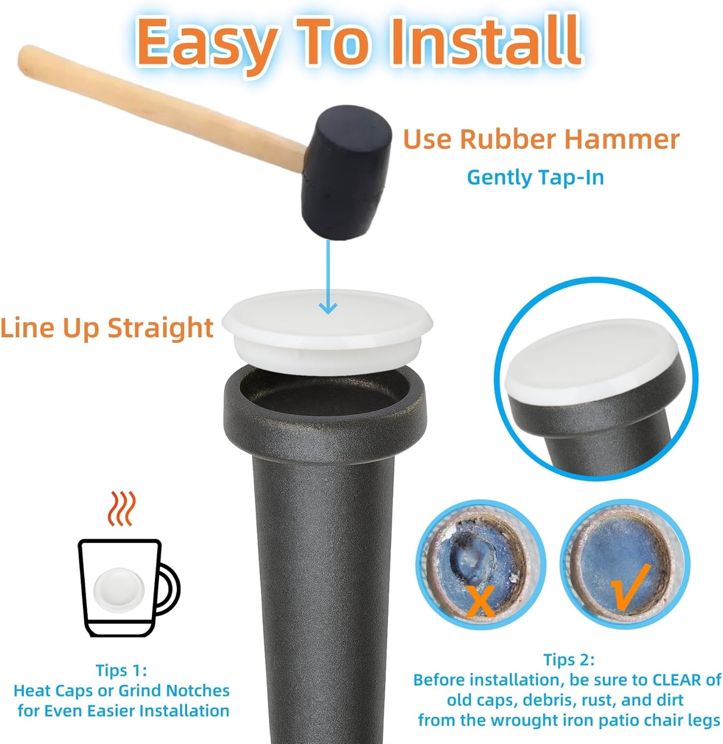 - Easy Installation, 24 Pack Value β Includes 24 patio chair feet caps for replacement glide caps of 6 chairs. Before installation, be sure to CLEAR of old caps, debris, rust, and dirt from the wrought iron patio chair legs, then tap the caps in with a rubber mallet. For even easier installation, heating the caps or grinding notches before fitting is recommended. These outdoor chair leg floor protectors provide lasting protection season after season.