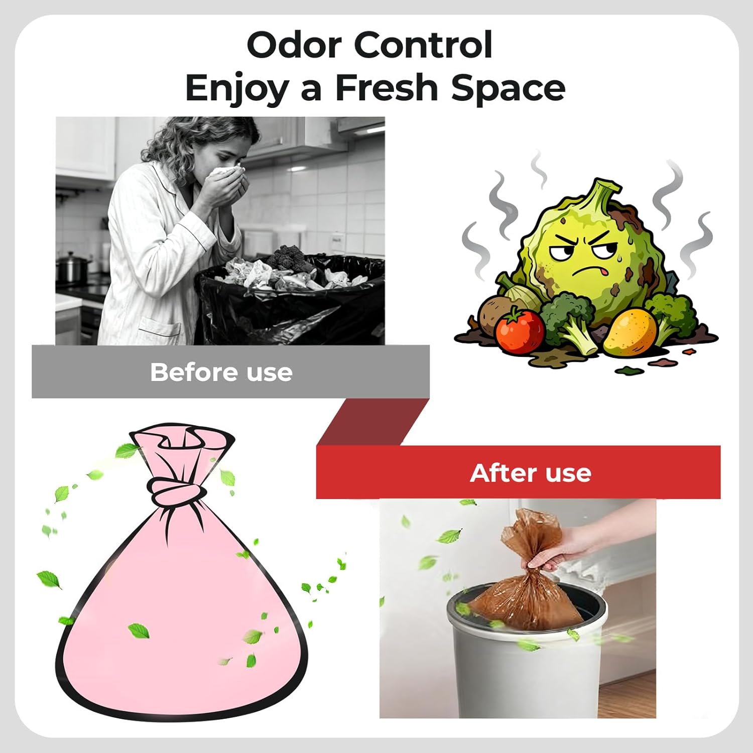 - Odor-Sealing for Fresh Environment: Built with odor-blocking technology that locks in smells and messes—perfect for disposing of kitchen waste. Strong enough to hold trash for 2–5 days without odors, so you don’t have to take it out every day