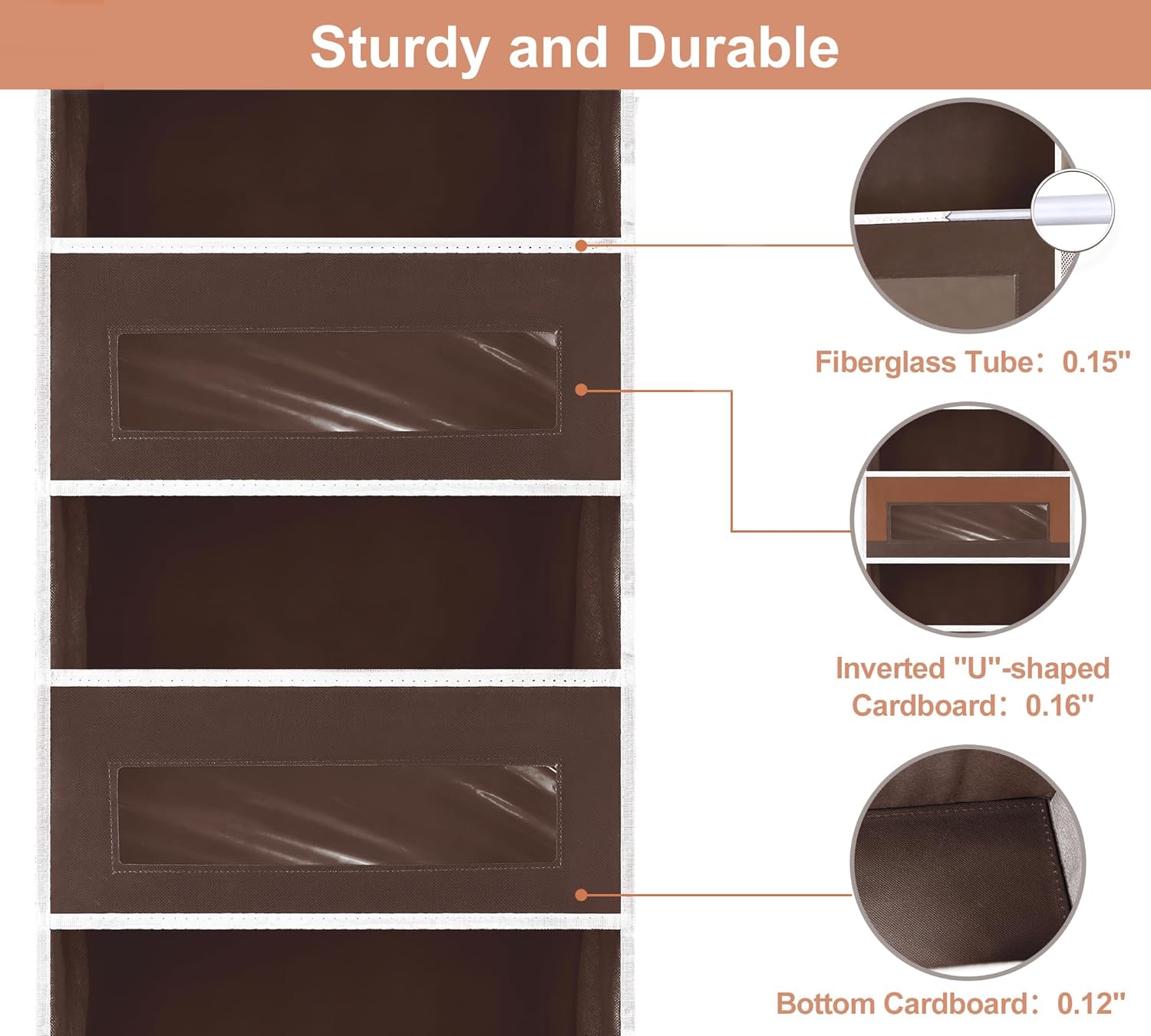 - Anti-warping & Durable: Each tier of hanging organizer features a reinforced bottom cardboard, while the pocket windows are supported by built-in inverted U-shaped cardboard and a fiberglass rod. This design keeps the shelves in shape even when holding heavy items