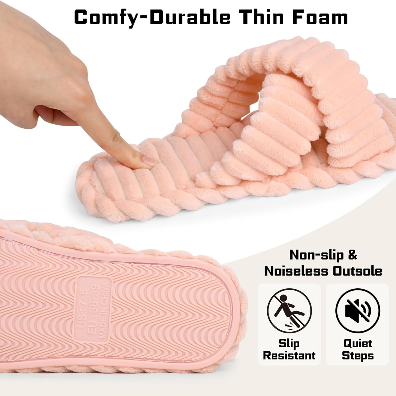 - ★Timeless Style Design - Designed with a stylish cross-band, these open-toe slippers keep your feet comfortable. With the quality short plush materials and fine workmanship, our slippers have a minimalist look and excellent texture, revealing an elegant and premium feel.