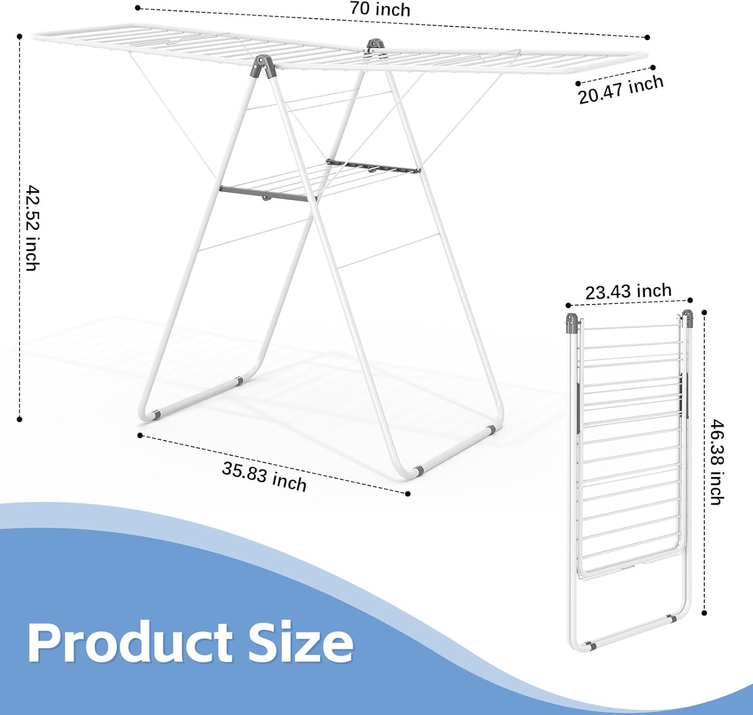 - Large drying space: 2-tier foldable rack. Top wings (70 inches) for quilts; 32 rods total, with the second tier for small items like socks/towels. Enough for the whole family.