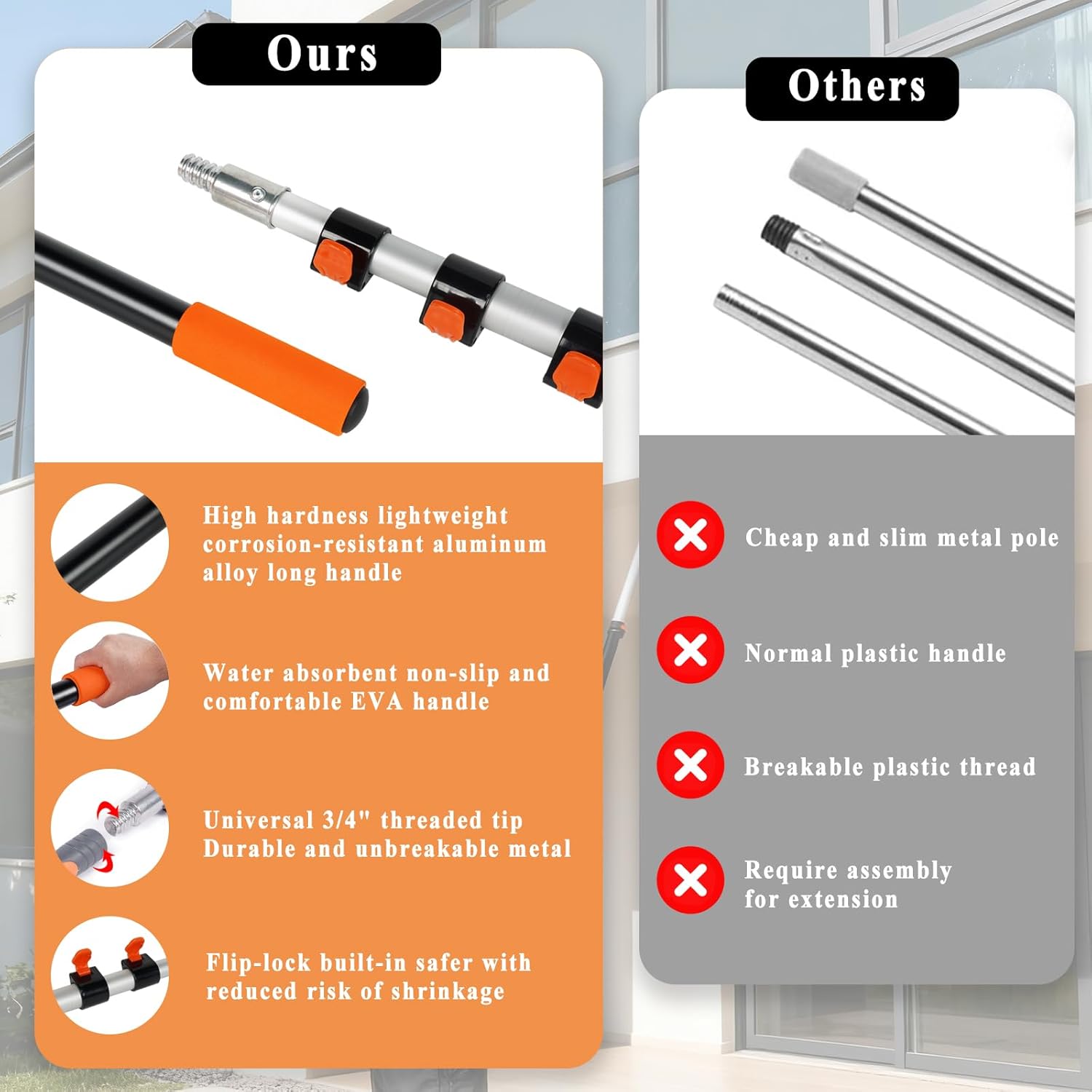- Heavy-Duty Telescopic Extension Pole β Crafted from lightweight yet durable aluminum alloy, it stays rigid even when fully extended. The non-slip EVA foam handle provides comfort, while the flip-lock system lets you easily adjust the length from 5 ft to 12 ft without sliding. In handheld use, it reaches up to 20 ft high, allowing you to clean ceilings, corners, and other hard-to-reach spots safely