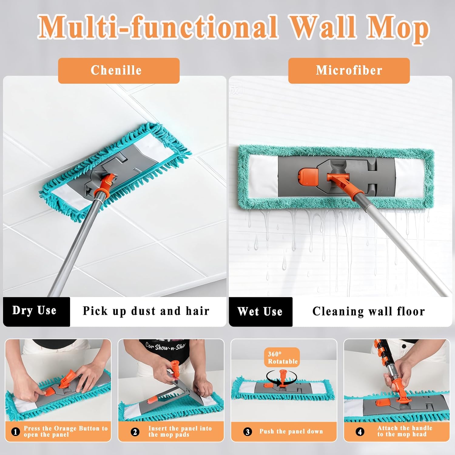- 360Β° Rotating Head & Wet/Dry Wall Cleaner Mop β Features a flexible 360Β° rotating head that easily reaches corners, high walls, and ceilings for efficient cleaning. Includes 2 microfiber pads for deep wet cleaning, ideal for bathroom walls and windows, and 2 chenille pads for dry dusting to remove dust, dirt, and hair
