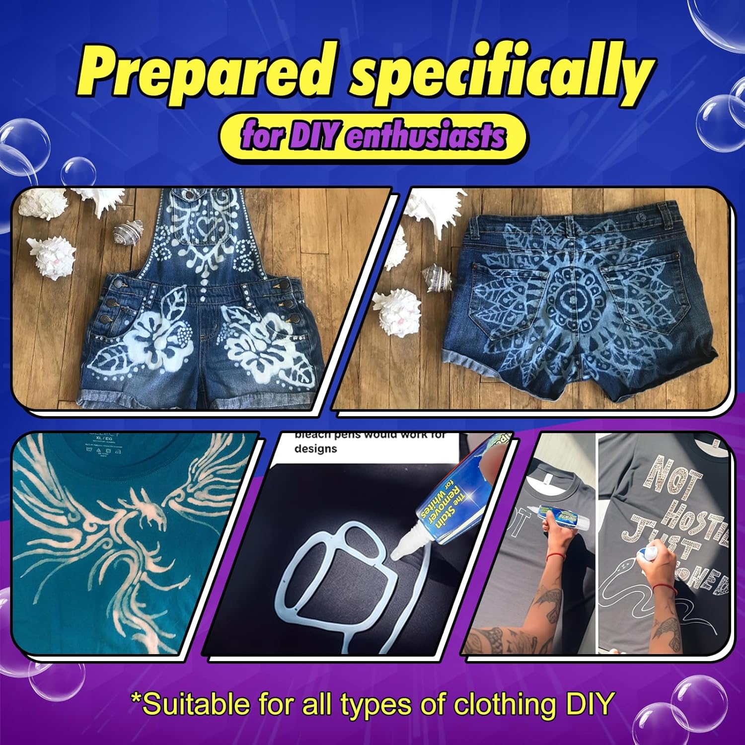 - CLOTHING DIY DESIGN: Please trust your own imagination. The DIY bleaching effect on pure black or pure non-white clothes, this pen can make you fall in love with it quickly. You can freely use your imagination to apply it on the clothes. It doesn't hurt your hands, is very gentle, and has a Orange-scented scent, which is very safe.
