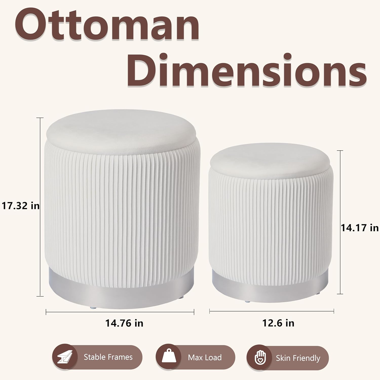- ćPerfect Space-Saving Set of 2ćThis round storage ottoman set includes two thoughtfully sized pieces designed to stack neatly together. The larger ottoman measures 14.76" x 14.76" x 17.32", while the smaller one is 12.6" x 12.6" x 14.17". This smart design offers a convenient space-saving solution, perfect for keeping your living room, bedroom, or entryway organized and clutter-free.