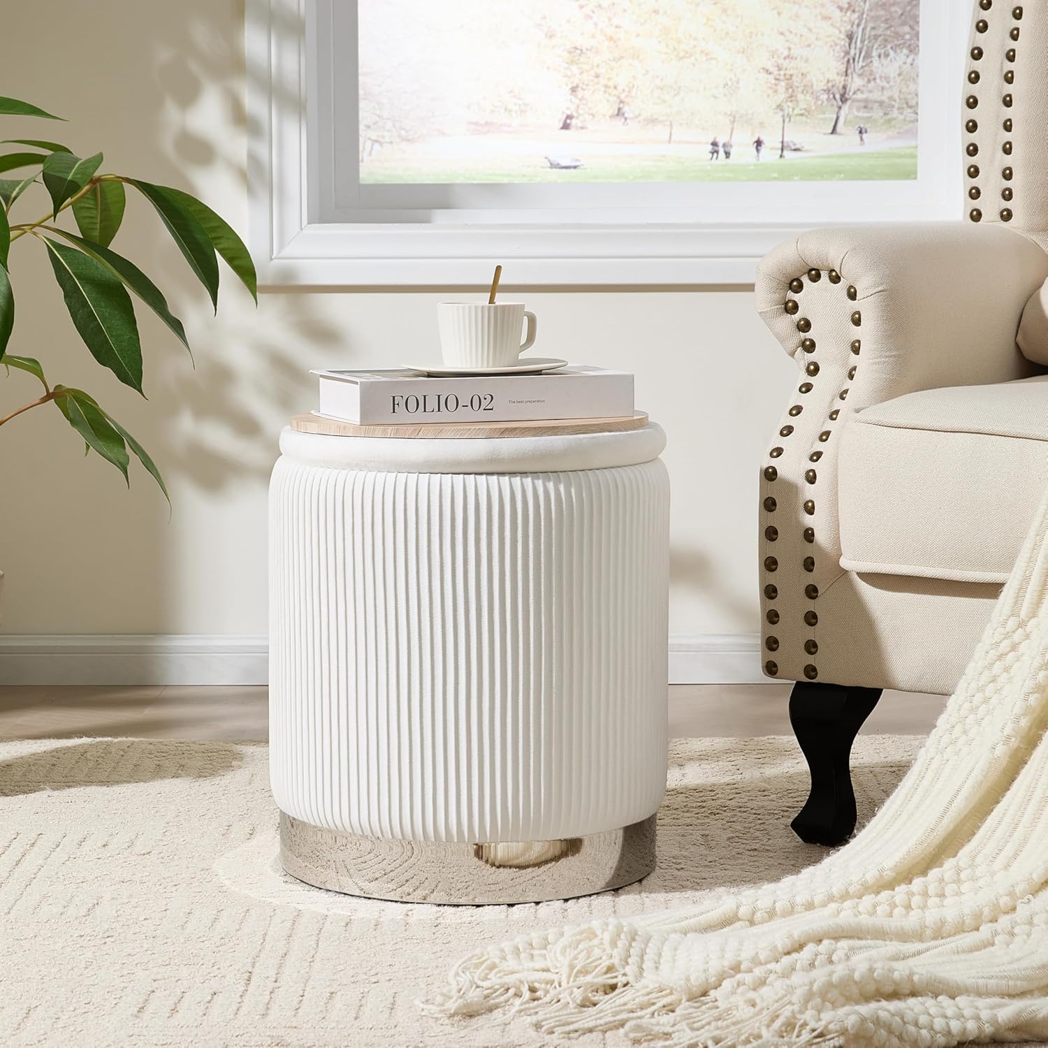 Royal Windsor Round Ottoman with Storage Set of 2, Vanity Stool with Storage for Bedroom, Ottoman Coffee Table Silver-Tone Ring Around The Base, Small Velvet Foot Stool for Living Room, White