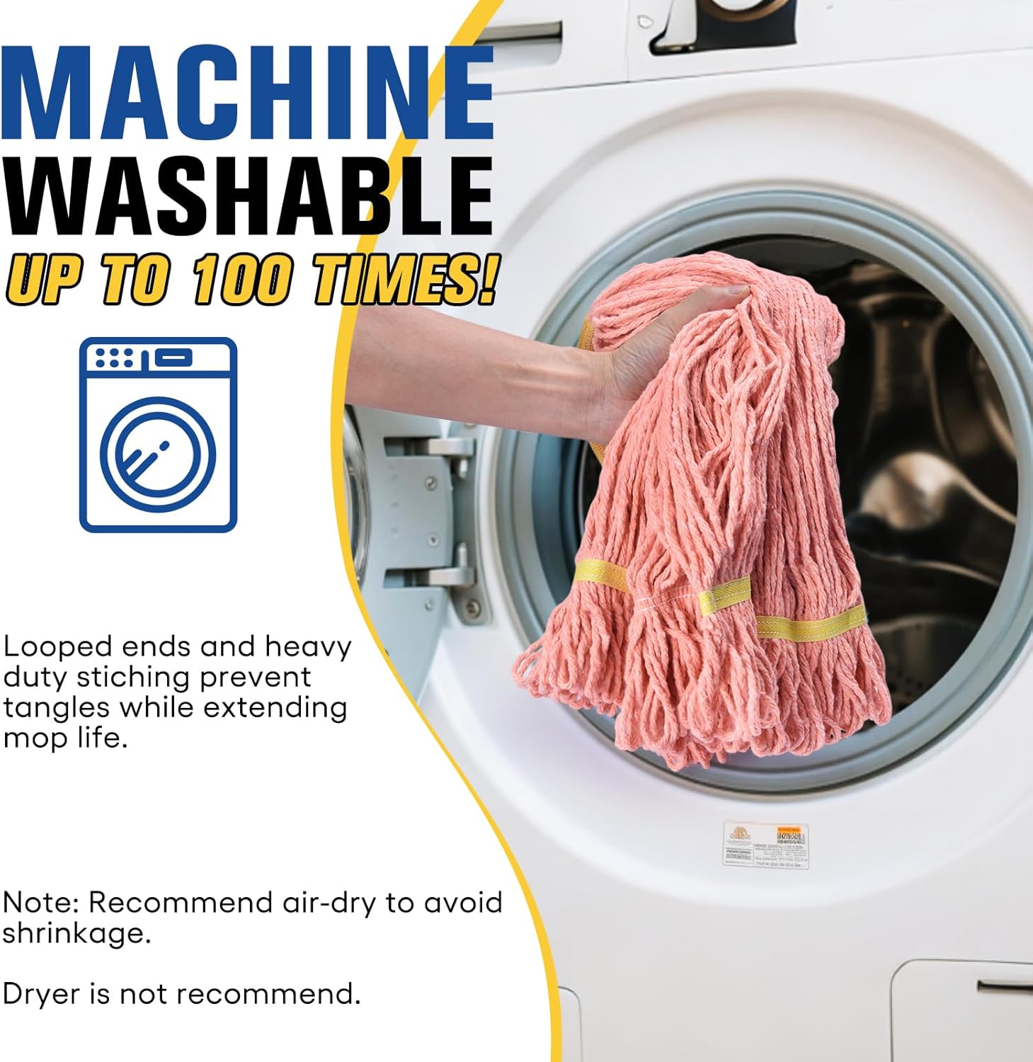 - Washable and Long-Lasting: Commercial mop heads are launderable for extended long-term usage. Long-lasting fibers allow the mop head to be washed many times giving it a longer service life. This washable mop head is launderable up to 100 times! NOTE: Do not use dryer after laundering to avoid shrinkage and loosen string, air-drying is recommended.