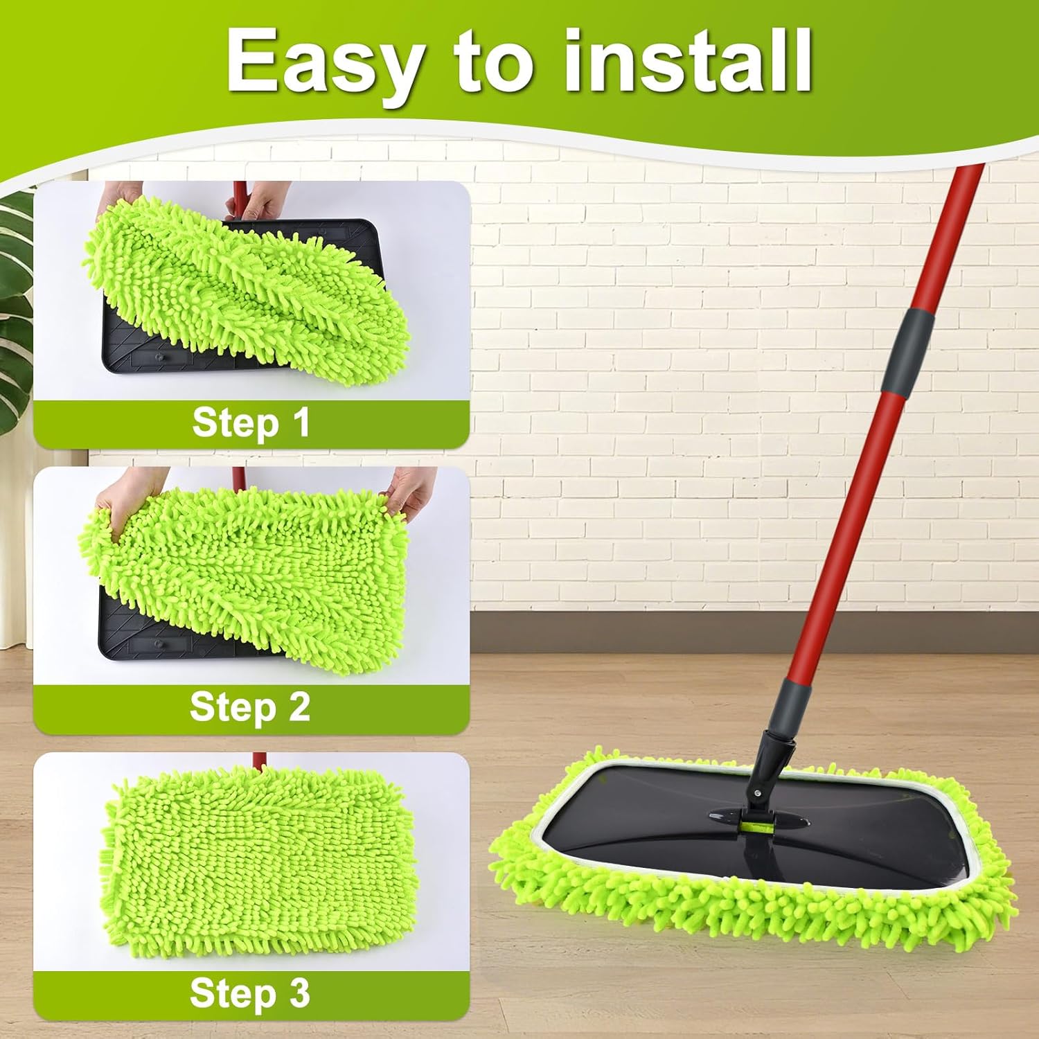 Mops for Floor Cleaning, Dust Mop for Hardwood Floors, Extra Large Floor Mop with Extendable Handle and 3 Reusable Chenille Mop Pads, Flat Dust Mops for Hardwood, Marble, Vinyl, Tile Floors Cleaning