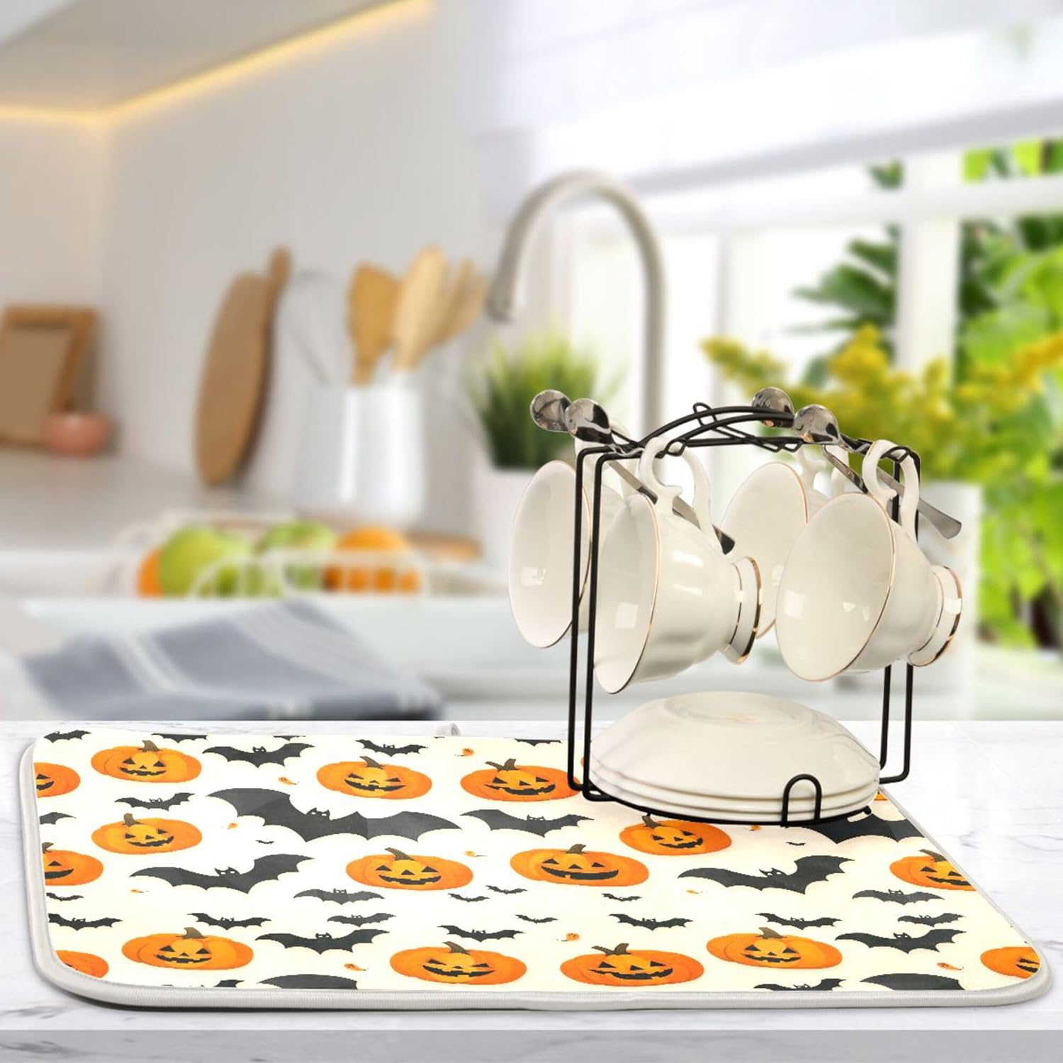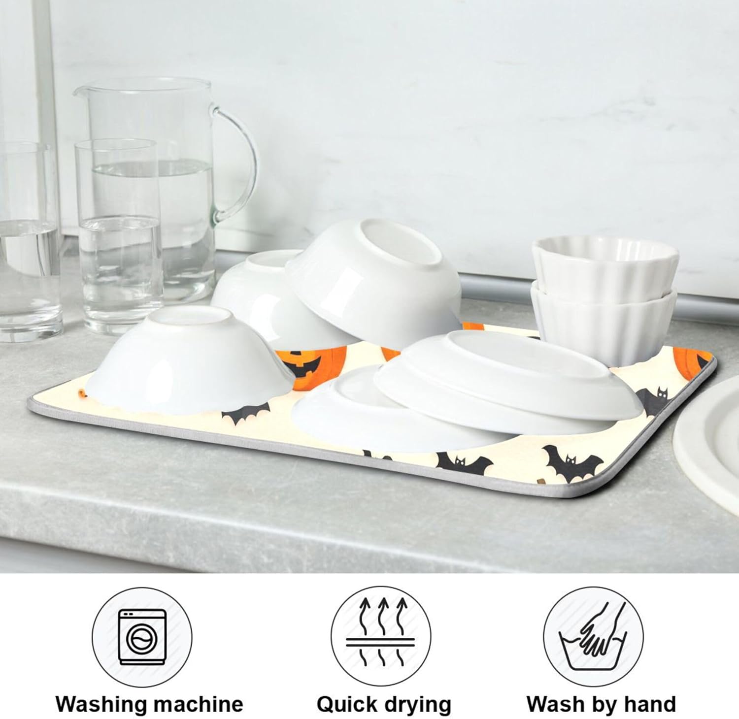 Halloween Black Bat Dish Drying Mat for Kitchen Countertop 18x24 Spooky Evil Pumpkin Lantern Large Drying Mat Reusable Quick Dry Dish Sink Mats Easy Clean Decorative Essentials