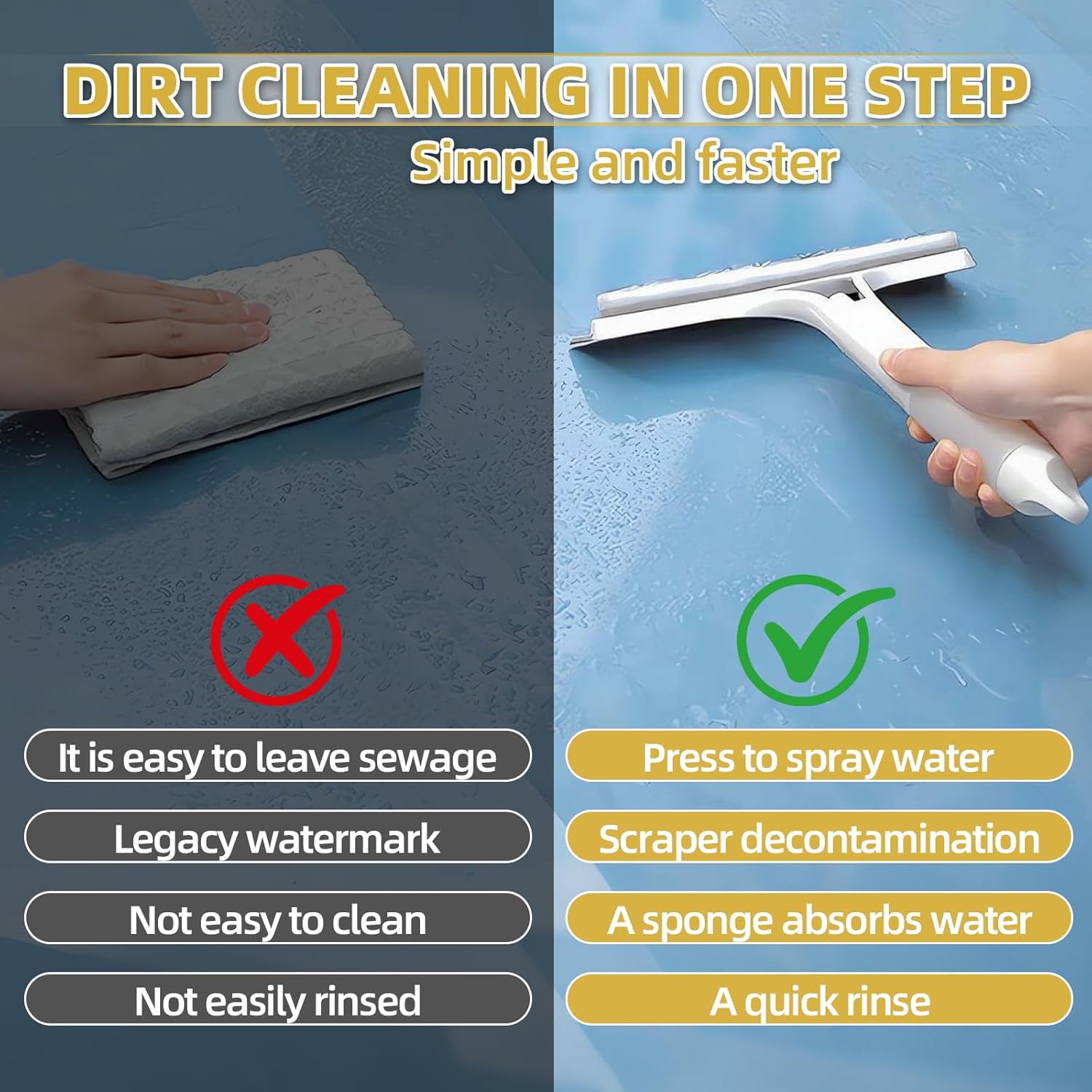 - Easy to Use: Pour the prepared cleaning solution into the spray bottle,spray directly on the surface to be cleaned,wipe with the sponge on the tool,and then scrape the water stains with the silicone scraper.No tedious steps,one tool can clean.