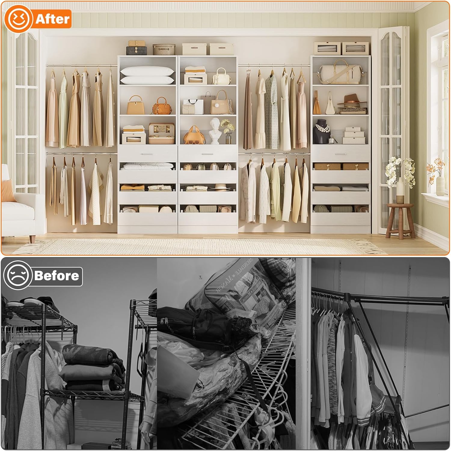 Aheaplus Closet System with 12 Drawers, 8.5-11.5Ft Wood Closet Organizer System with 4 Hanging Rods & 3 Towers, 4Ft & 6Ft L-Shaped Walk-in Closets Wardrobe Organizer Clothes Rack, Set of 3, White