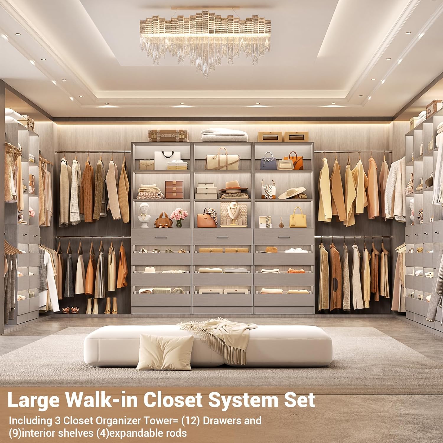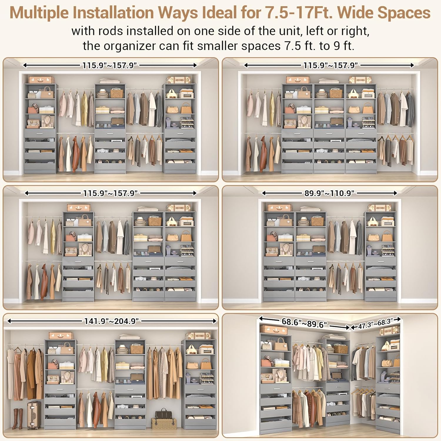 Aheaplus Closet System with 12 Drawers, 8.5-11.5Ft Wood Closet Organizer System with 4 Hanging Rods & 3 Towers, 4Ft & 6Ft L-Shaped Walk-in Closets Wardrobe Organizer Clothes Rack, Set of 3, Grey