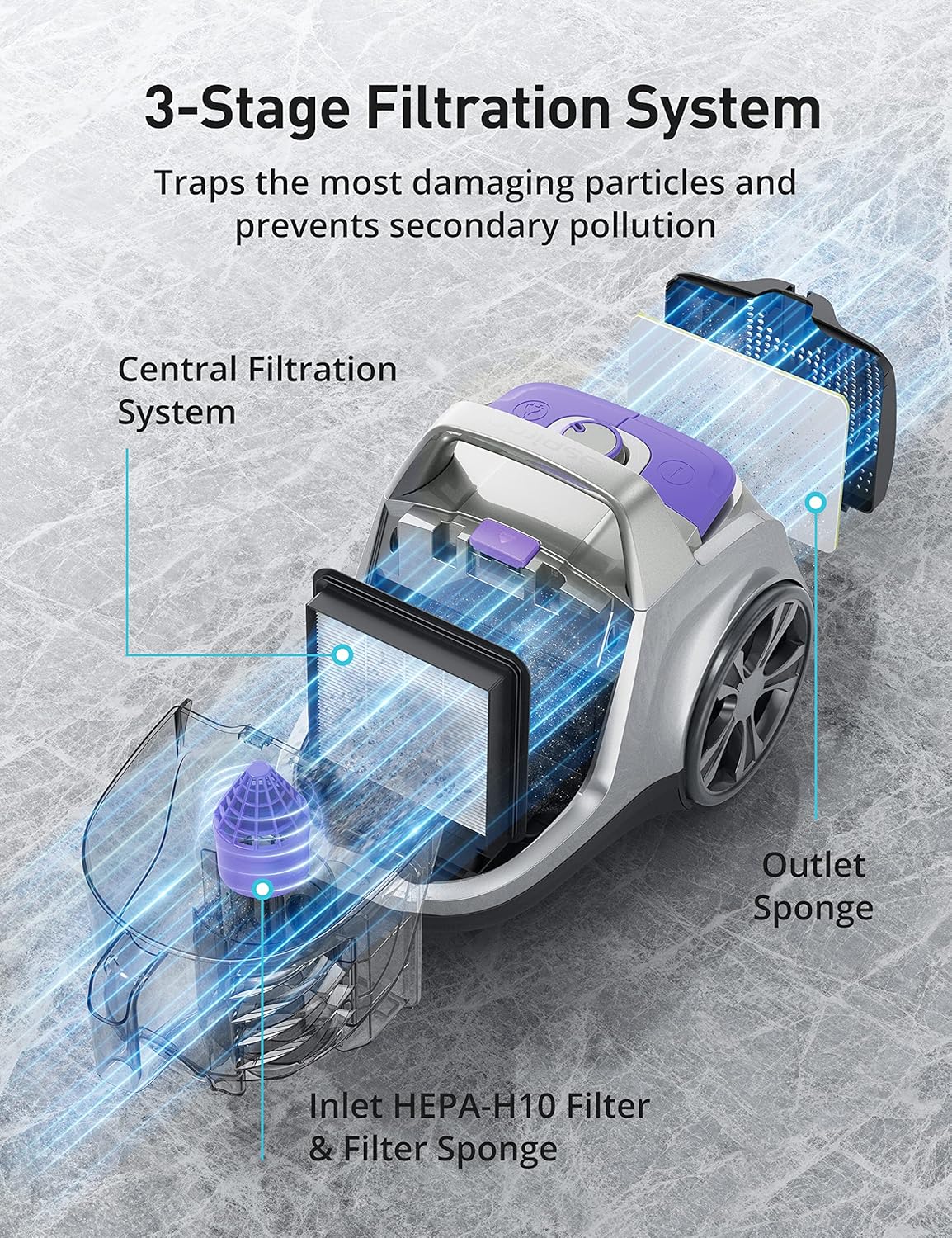 Aspiron Canister Vacuum, Upgraded 1600W Bagless Canister Vacuum Cleaner, Auto Cord Rewind, H13 HEPA Filter, 3.7Qt Large Capacity, 5 Tools for Hard Floors, Carpet, Pet, Upholstery, Tiles, Car, Lavender