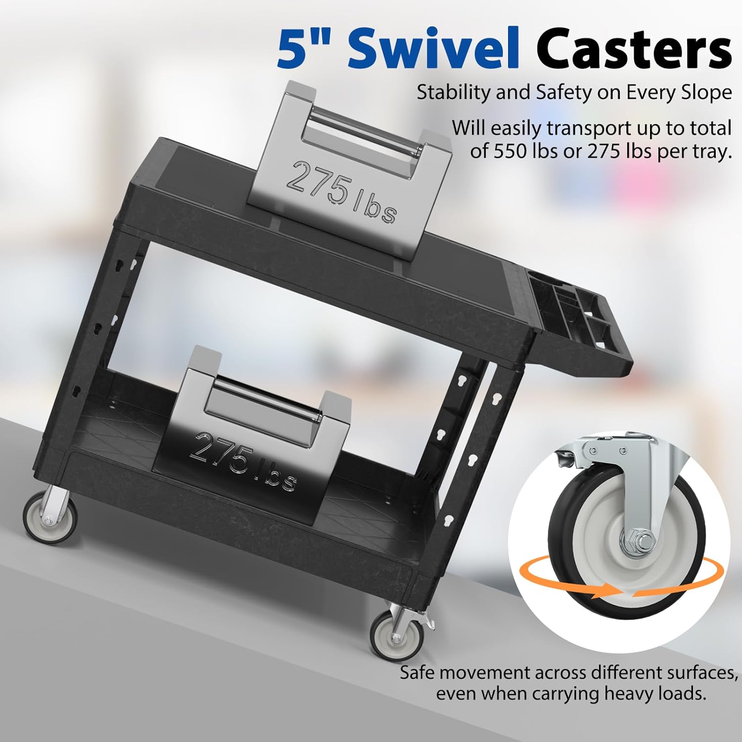 Heavy Duty Flat Top Utility Cart with Wheels 2-Tier Utility Plastic Service Work Cart for Shop, Garage, Warehouse, Maintenance 550 lbs