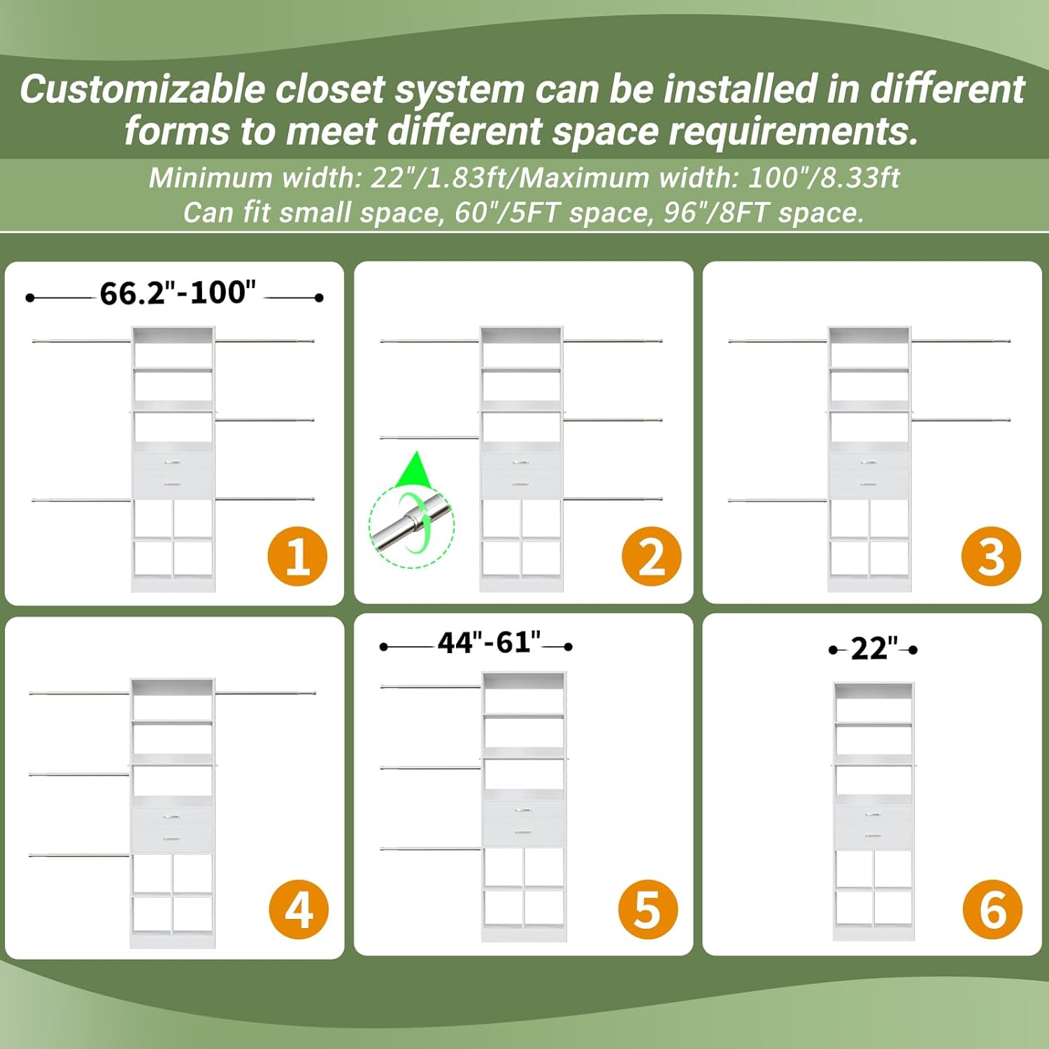 Closet System, 4-8 FT Closet Organizer Tower with 2 Wooden Drawers and Shelves, Can Fit 60 to 96 inch Walk-in Closet System with 5 Hanging Rods, Built-in, White