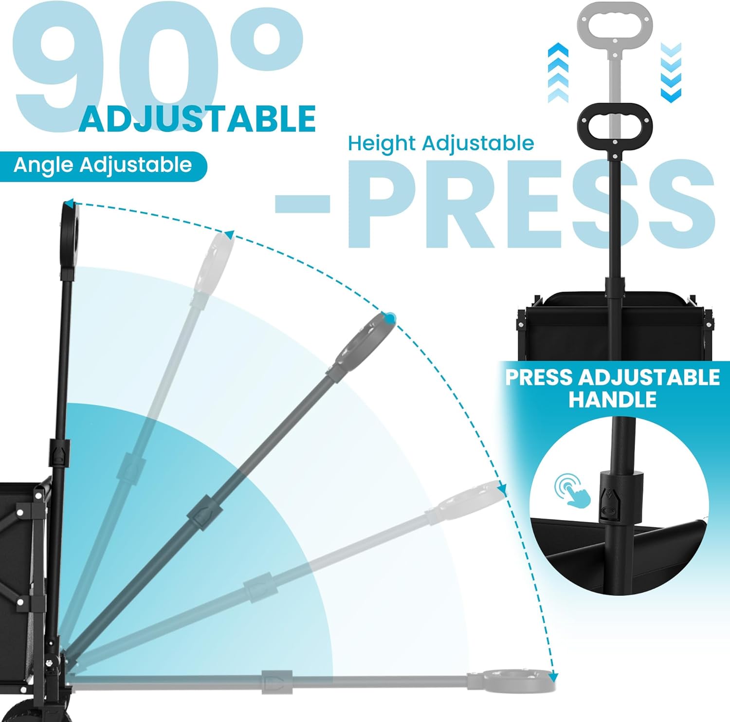 - 【Manoeuvrability Foldable Wagon】Equipped with two 360° swiveling front wheels,this wagon glides smoothly not just on regular roads, but also tackles tricky surfaces such as meadows and gardens with ease.The telescopic handle adjusts to different heights, ensuring a comfortable grip for users of all statures.